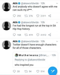 AKA is known for expressing controversial sentiments, while most agreed that he is the GOAT who has inspired all other rappers some felt he was blowing too much of his own horn. “I am the reason you can in English,” he wrote.