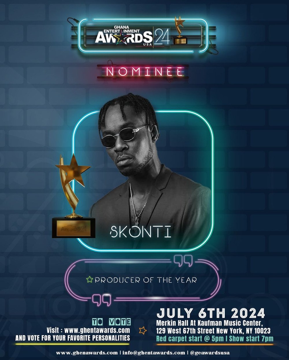 Since breaking into the industry, Skonti has amassed many devoted fans and produced several well-received songs that have established him as one of the hottest talents in the industry. On July 6, he will be vying for the honor of “Producer of the Year Music” at the Ghana Entertainment Awards USA 2024, scheduled to go down at New York City’s Kaufman Music Center. To support Skonti, vote for him here: https://ghentawards.com/vote/